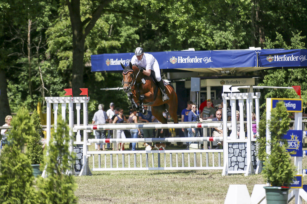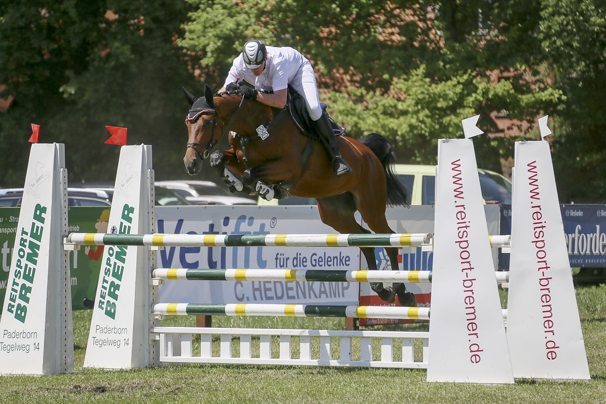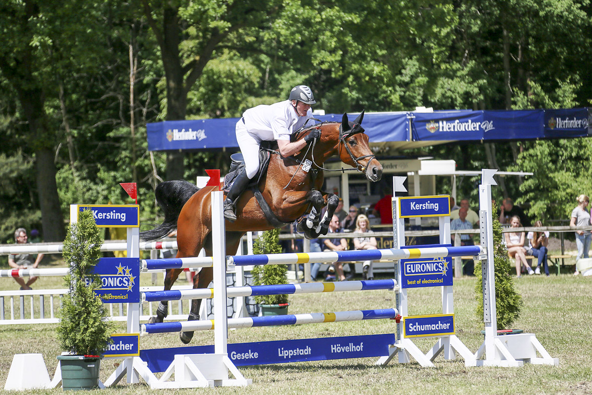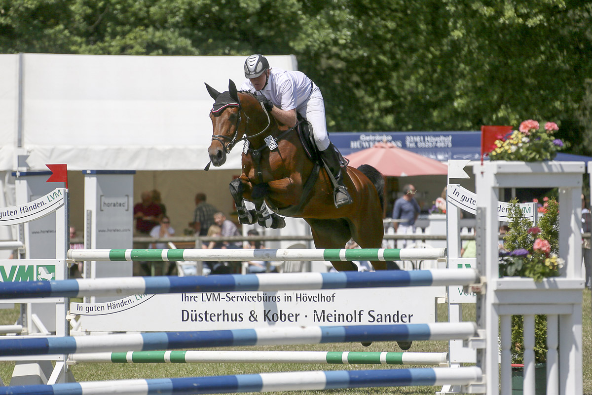 Heute kamen tolle Fotos von Peter Österdiekhoff mit Clairchen 07 von der Springpferde Kl. M in Hövelhof an. Unsere Clairchen hat eine wunderbare Bascule, dazu noch blitzschnelle Vorderbeine. Jetzt wo es höher wird, fängt auch sie aufgrund ihres enormen Sprungvermögens - wie Halbschwester Coeur de Marie - - erst an, die Sprünge für voll zu nehmen. Und auch wie Mari überspringt sie sich immer noch sehr viel auf natürliche Weise....